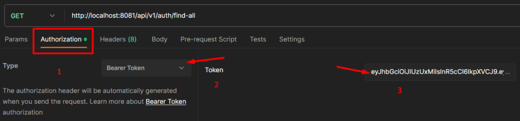 In short, it is explained here that while any user can access the endpoints “api/v1/auth/register” and “api/v1/auth/login”, having the admin role is required to make requests to the “api/v1/auth/find-all” endpoint.