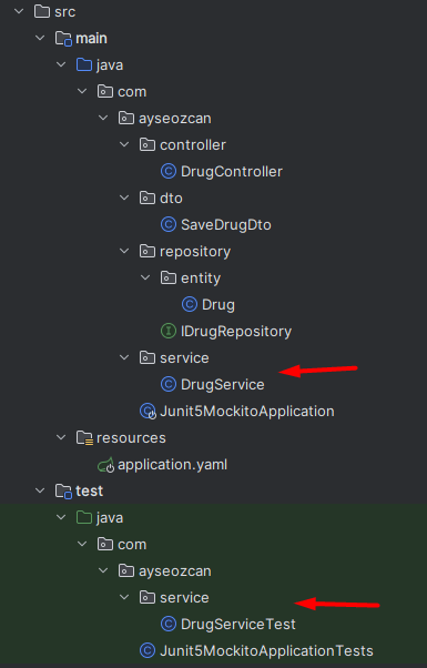 We will write a test class for the two methods in the DrugService class.
